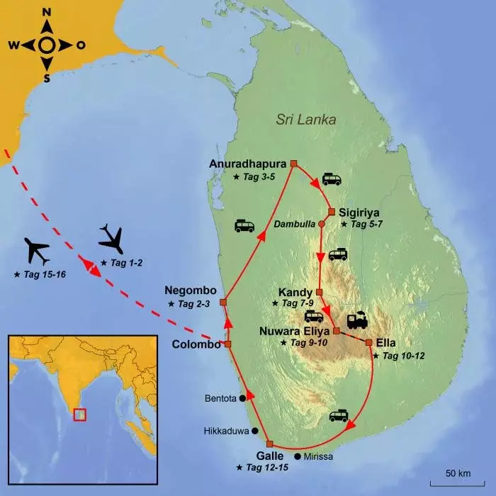 Zunächst geht es an den goldenen Sandstrand von Negombo, bevor die Reise in den Nordosten zum kulturellen Dreieck Sri Lankas führt, wo Sie in die bewegte Geschichte und das Kulturerbe des Landes eintauchen können.