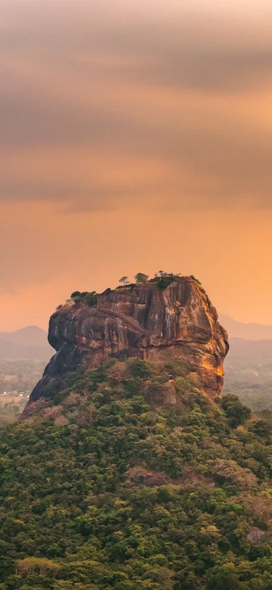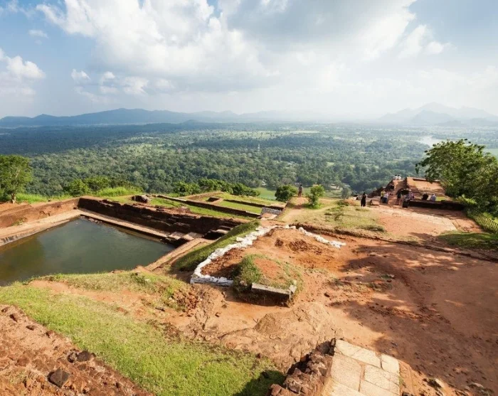 Oben auf dem flachen Felsen finden Sie ein unvergessliches Erlebnis. Hier bestaunen Sie den Panoramablick über die antiken Palastruinen mit ihren Gräben, Wasserelementen und üppigen Gärten. Am Horizont erstreckt sich eine grüne Weite von Dschungel, Bergen und Dörfern, mit dem entfernten Anblick des Pidurangala-Felsens.