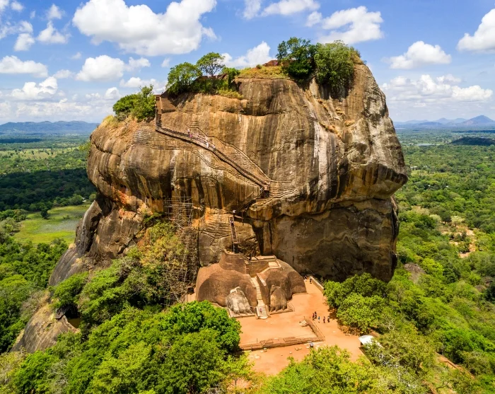 Oben auf dem flachen Felsen finden Sie ein unvergessliches Erlebnis. Hier bestaunen Sie den Panoramablick über die antiken Palastruinen mit ihren Gräben, Wasserelementen und üppigen Gärten. Am Horizont erstreckt sich eine grüne Weite von Dschungel, Bergen und Dörfern, mit dem entfernten Anblick des Pidurangala-Felsens.