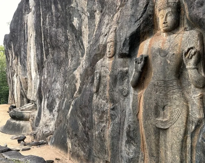 Weiter geht es zum Buduruwagala-Tempel, der ins 10. Jahrhundert zurückreicht und für seine gut erhaltenen Felsenkunstwerke bekannt ist. Der Tempel besteht aus einer großen Felswand mit einer 16 Meter hohen Buddha-Statue, umgeben von sechs kleineren Figuren, die Buddha in verschiedenen meditativen Haltungen darstellen. Ihre filigranen Details und gelassenen Ausdrücke können in aller Ruhe bewundert werden, da Buduruwagala ein ruhigeres Dasein führt als die zuvor besuchten Tempel.