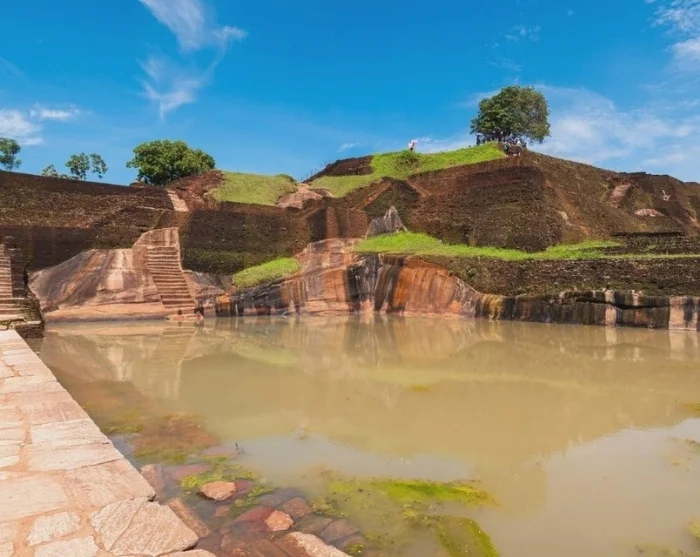 Auf dem ebenen Gipfel des Felsens erwartet Sie ein Erlebnis, das Sie so schnell nicht vergessen werden. Dort können Sie die einmalige Aussicht über die Ruinen des ehemaligen Königspalastes mit Burggraben, Wasseranlage und üppigen Gärten bewundern. Am Horizont erstreckt sich ein grünes Meer aus Dschungel, Bergen und Dörfern und in der Ferne erahnt man den Pidurangala-Felsen.