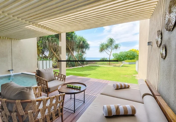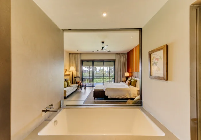 Sie wohnen in einem Deluxe-Zimmer mit Meerblick – dieser Standard ermöglicht es Ihnen, das exotische Ambiente rundum zu genießen. Die Einrichtung ist modern und hell gehalten, mit beruhigenden Farbtönen und einem azurblauen Boden, der die Farben des Ozeans stilvoll aufgreift. Jedes Zimmer ist komfortabel ausgestattet mit WLAN, Klimaanlage, TV, Minibar, Tee- und Kaffeezubereitungsmöglichkeiten sowie einem Safe. Im Badezimmer erwarten Sie ein Bademantel, Pflegeprodukte, eine Badewanne und eine separate Dusche. Ihr privater Balkon oder Ihre Terrasse lädt dazu ein, zu entspannen und den weiten Blick auf den Indischen Ozean zu genießen.