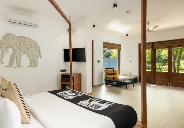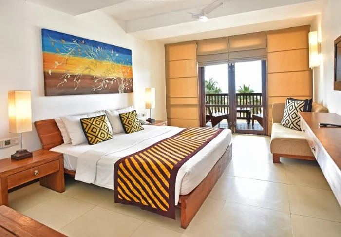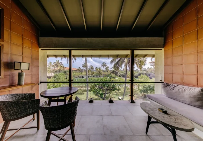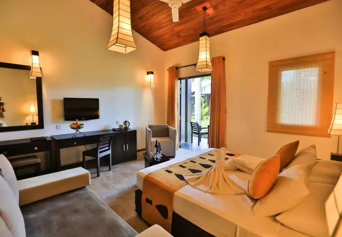Sie übernachten in einem Deluxe Zimmer, das in einem modernen, minimalistischen Stil eingerichtet ist. Helle Farbtöne und feine sri-lankische Akzente schaffen ein ausgewogenes Zusammenspiel aus Schlichtheit und behaglicher Wärme. Ihnen stehen Klimaanlage, WLAN, Satelliten-TV, Safe, Schreibtisch, Sitzecke, Telefon sowie eine Minibar zur Verfügung. Das Badezimmer bietet sowohl eine Badewanne als auch eine Dusche sowie kostenlose Pflegeprodukte. Treten Sie auf Ihren privaten Balkon und genießen Sie die friedliche Gartenatmosphäre – vielleicht mit einem guten Buch in der Hand.