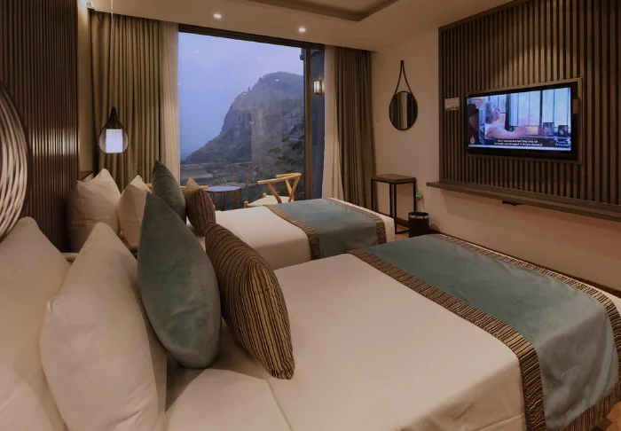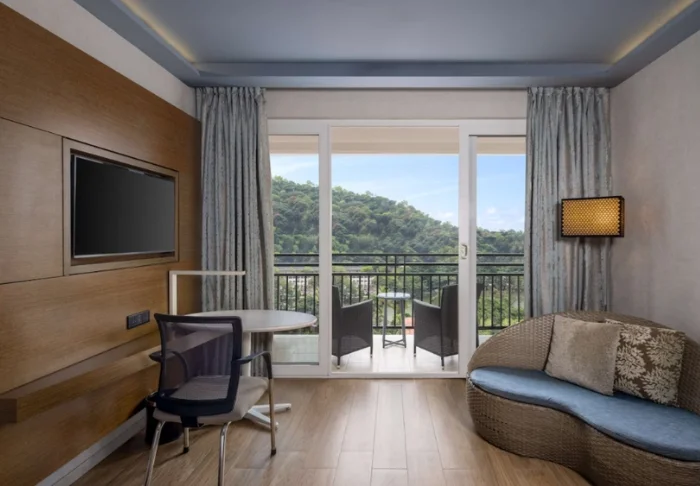 Sie übernachten in einem Deluxe Zimmer, das im modernen, urbanen Stil gestaltet ist und durch große Panoramafenster besonders viel Tageslicht ins Innere lässt. Der Ausblick auf die beeindruckende Landschaft ist faszinierend – es fällt schwer, dem Wunsch zu widerstehen, hinaus auf den eigenen Balkon zu treten und einfach für einen Moment die Gedanken schweifen zu lassen. Ihr Zimmer ist bestens ausgestattet und bietet Klimaanlage, WLAN, TV, Tee- und Kaffeezubereitungsmöglichkeit, Minibar und einen Safe. Im Bad finden Sie eine begehbare Dusche, Hausschuhe sowie kostenfreie Pflegeprodukte.