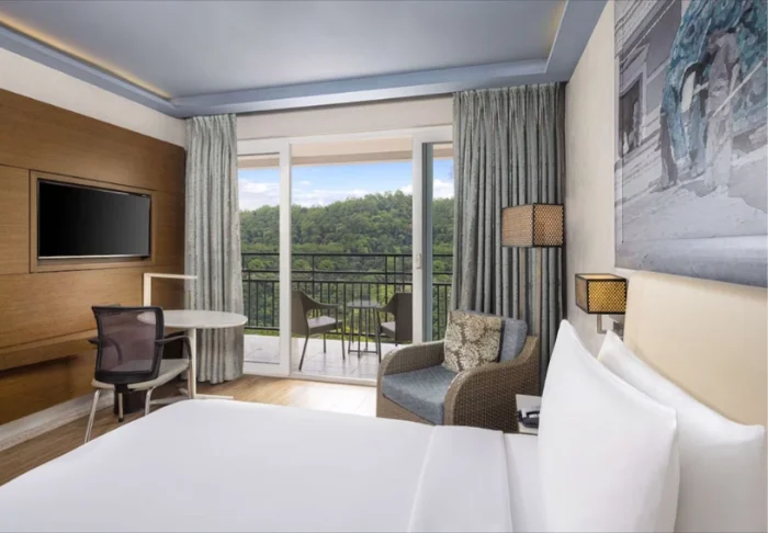Sie übernachten in einem Deluxe-Zimmer, das Sie mit warmen Farbtönen und natürlichen Details empfängt – perfekt abgestimmt auf den großartigen Blick über den See und den üppigen Poolbereich des Hotels. Alle Zimmer sind komfortabel mit Klimaanlage, WLAN, Minibar, Safe, Kaffee- und Teezubehör sowie TV ausgestattet. Im Badezimmer erwarten Sie zudem Pflegeprodukte und eine Dusche.