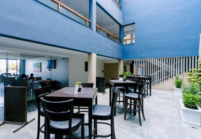 Im gemütlichen Innenhof des Hotels schaffen üppiges Grün und ein Teich voller orangefarbener Karpfen eine ruhige Oase. Jeden Morgen wird hier ein liebevoll zubereitetes Frühstück serviert, das die einladende und familiäre Atmosphäre unterstreicht, die Sie während Ihres gesamten Aufenthalts begleitet.