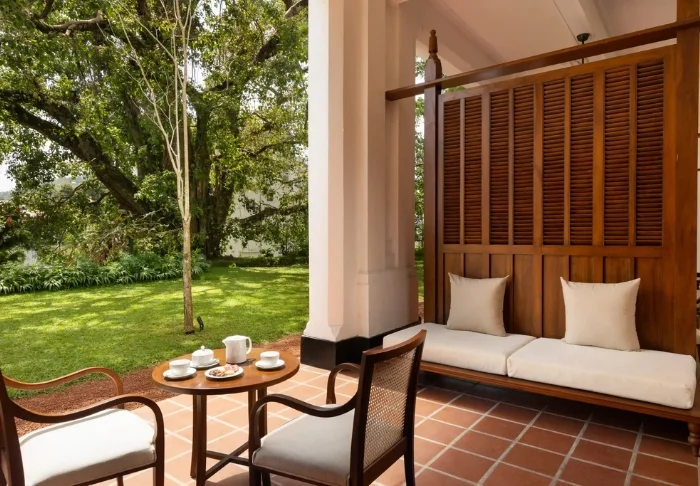 Sie wohnen standardmäßig in einem Bungalow-Zimmer, das im einladenden Garten des Hotels liegt. Das Zimmer ist einfach, aber geschmackvoll im klassischen Kolonialstil eingerichtet. Es bietet viel Platz und zahlreiche Annehmlichkeiten wie Klimaanlage, Minikühlschrank, Tee- und Kaffeezubereitungsmöglichkeiten sowie ein großzügiges Bad mit kostenfreien Pflegeprodukten. Auf Ihrer privaten Terrasse erwarten Sie besondere Momente zu zweit – ob beim Kartenspielen oder bei anregenden Gesprächen, während Ihr Blick über die grüne Landschaft schweift.