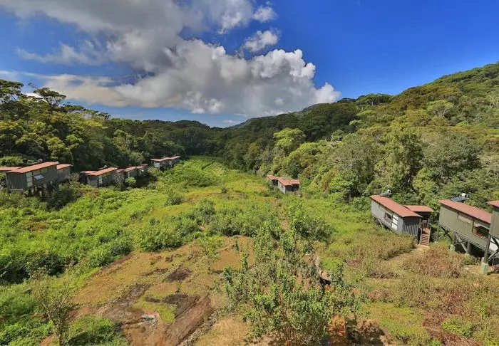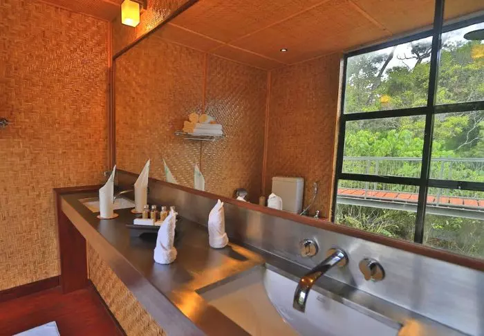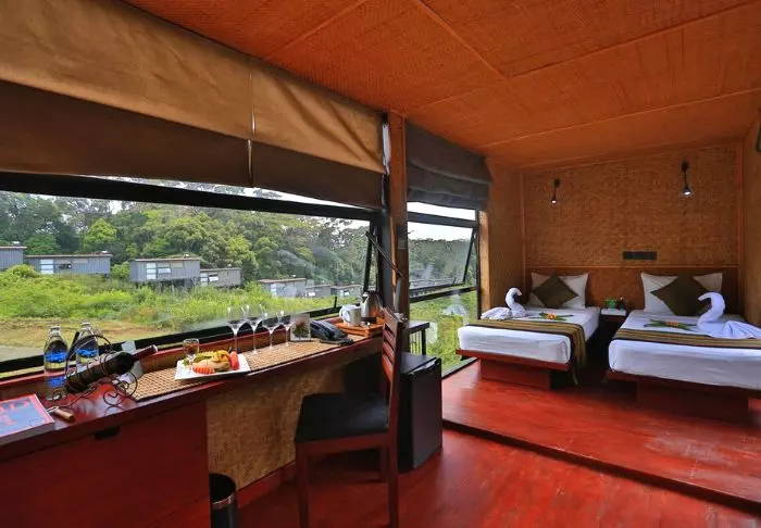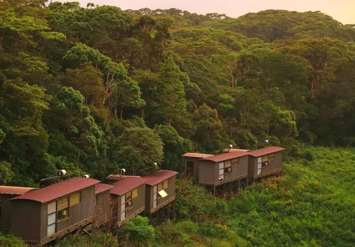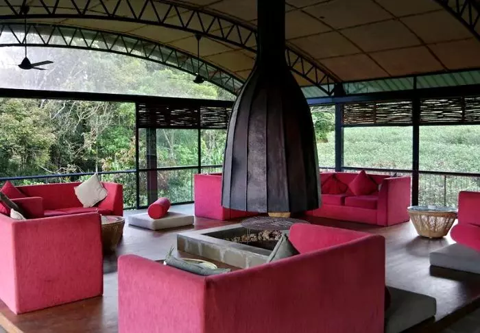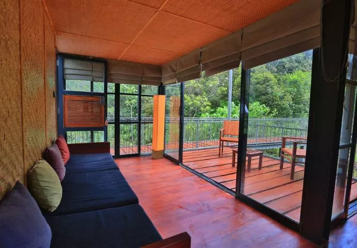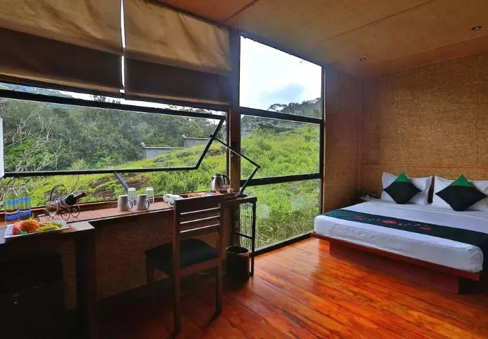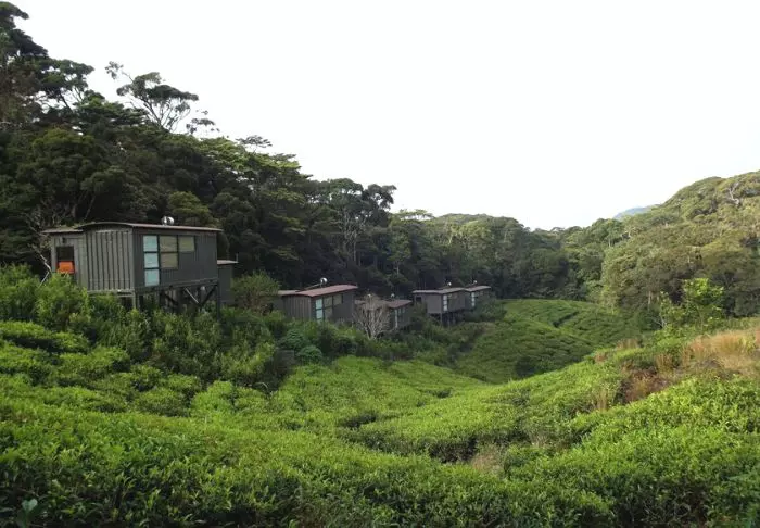 Die Lodge besteht aus 20 Hütten, die über die grüne Teeplantage verteilt sind. Alle wurden aus Recycelmaterialien errichtet. Die Hütten selbst bestehen aus alten Schiffscontainern. Wände und Decken wurden aus Bambus, die Terrassen aus Eisenbahnschwellen errichtet.