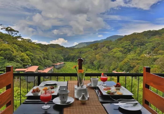 Jede Hütte verfügt über ein Schlafzimmer, ein Badezimmer und eine Terrasse. Es stehen zudem eine Tee- und Kaffee-Ecke, ein Safe, gratis Wasserflaschen, ein Telefon und ein Föhn zur Verfügung. Im Badezimmer bietet die Dusche sowohl warmes als auch kaltes Wasser. Die Hütten besitzen außerdem große Fenster, sodass Sie die atemberaubende Aussicht auf die Teeplantage, den Regenwald und die grünen Berge überall in der Hütte genießen können. Morgens können Sie sich mit einer Tasse dampfendem Tee oder Kaffee auf die Terrasse setzen und den Lauten des Regenwaldes und der Wildtiere lauschen. Wenn sich der Nebel lichtet, können Sie mit etwas Glück neugierige Eichhörnchen beobachten, die hier in der Umgebung leben.