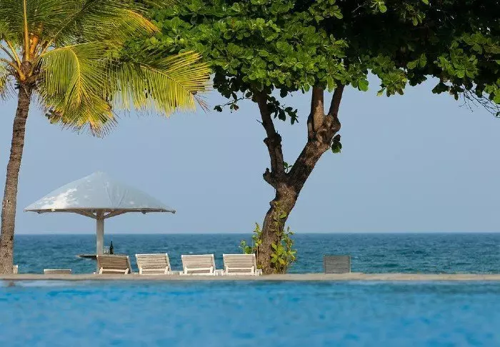 Der großzügige Poolbereich des Hotels erstreckt sich entlang des Strandes, umgeben von Palmen und üppigem Grün. Hier können Sie sich bei einem erfrischenden Bad abkühlen oder auf einer Sonnenliege mit einem kühlen Getränk entspannen. Wer sich etwas gönnen möchte, findet im Spa eine Auswahl an wohltuenden Massagen und Schönheitsanwendungen. Für alle, die aktiv sein möchten, stehen zudem ein Fitnessraum und sogar ein Squash-Court zur Verfügung. Direkt am Strand warten die hoteleigenen Liegen und Sonnenschirme darauf, dass Sie sich bei vollkommener Ruhe und Entspannung der Sonne hingeben.