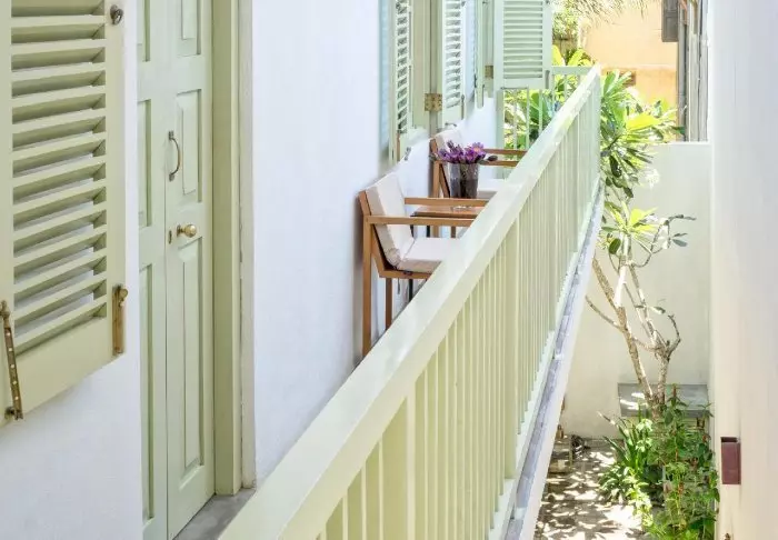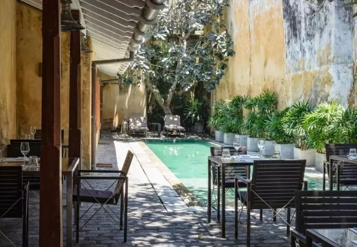 Das Hotel besitzt einen idyllischen Innenhof mit herrlichen Plumeria-Pflanzen, die einen wunderschönen Kontrast zu den malerischen, verblichen-gelben Mauern bilden. Es gibt auch einen kleinen Pool mit dazugehörigen Liegestühlen.