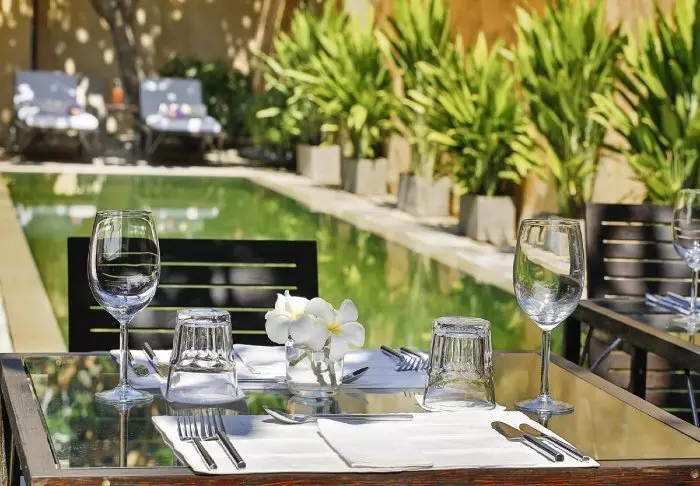 Im Innenhof steht immer elegantes Gedeck bereit, wenn Sie Frühstück, Mittagessen oder Abendessen in dieser zauberhaften Umgebung einnehmen möchten. Wenn Sie nicht draußen sitzen möchten, steht auch ein eleganter Speisesaal zur Verfügung.