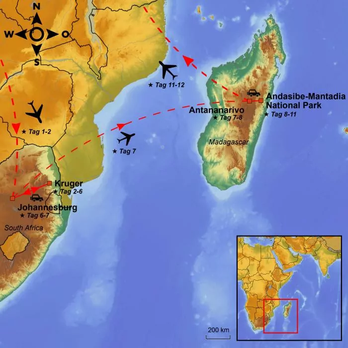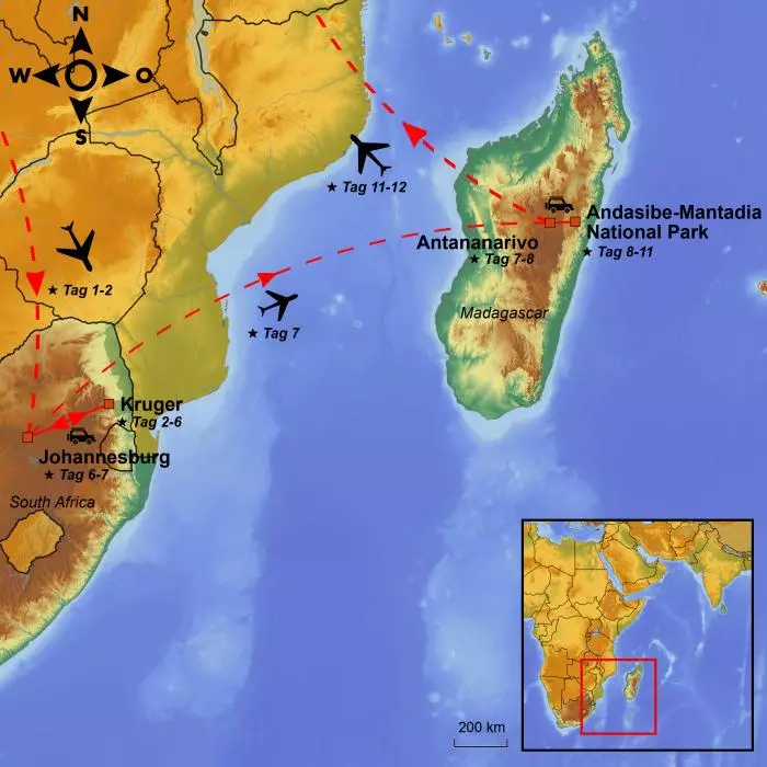 Vom wohlbekannten Südafrika führt die Reise zu etwas unbekannteren Gefilden: Nach Madagaskar. Hier treffen Sie auf die Geschichte von Königen und Königinnen und erfahren mehr über die reiche Histroie des Landes, bevor Sie im Andasibe-Mantadia Nationalpark nach Lemuren, Stabheuschrecken und farbenfrohen Chamäleons Ausschau halten.