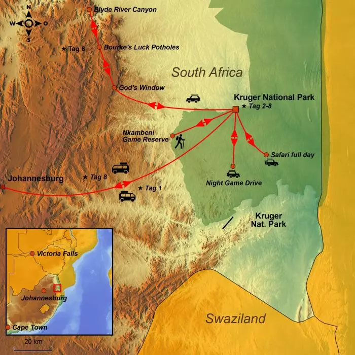 Während der Reise wohnen Sie in der Kruger Gate Hotel, die am Rand des Krüger-Nationalparks liegt. Dort werden Sie Safaris unternehmen und dabei Elefanten, Nashörner, Büffel, Löwen und Leoparden zu Gesicht bekommen. Den Geheimnissen der afrikanischen Natur kommen Sie bei einer Exkursion mit einem Ranger auf die Spur.