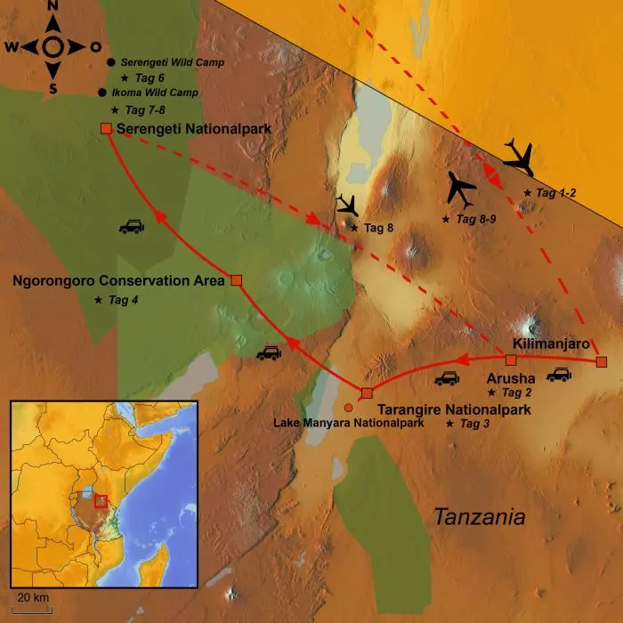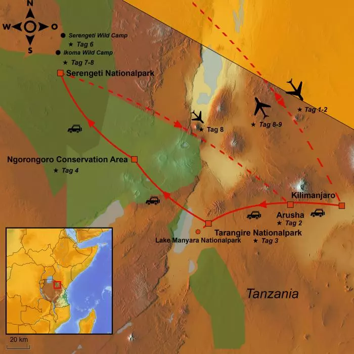 Sie erleben die berühmtesten Nationalparks Nordtansanias, fahren auf unbekannten Nebenstraßen zwischen einigen der Parks und sehen einheimische Dörfer, die kaum ein Reisender von außen besucht.