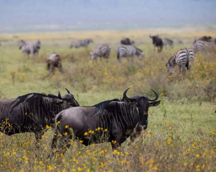 Die einzige klassische Safaritierart, die Sie hier nicht finden werden, ist die Giraffe. Warum das so ist, können Sie sich auf dem Weg hinunter in den Krater überlegen. Ansonsten sind hier alle Safaritiere zu finden – und zwar in großer Zahl! Elefanten, Zebras, Gnus, Büffel, Löwen, Flamingos, Flusspferde, Antilopen, Störche, Hyänen, Schakale – ja, mit etwas Glück sehen Sie sogar das vom Aussterben bedrohte Spitzmaulnashorn.