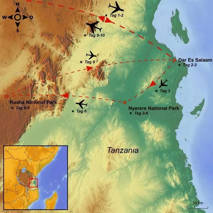 Heute erfolgt der Abflug von Ihrem gewählten Flughafen, und die Reise geht mit Zwischenlandung(en) unterwegs nach Tansania in Ostafrika.