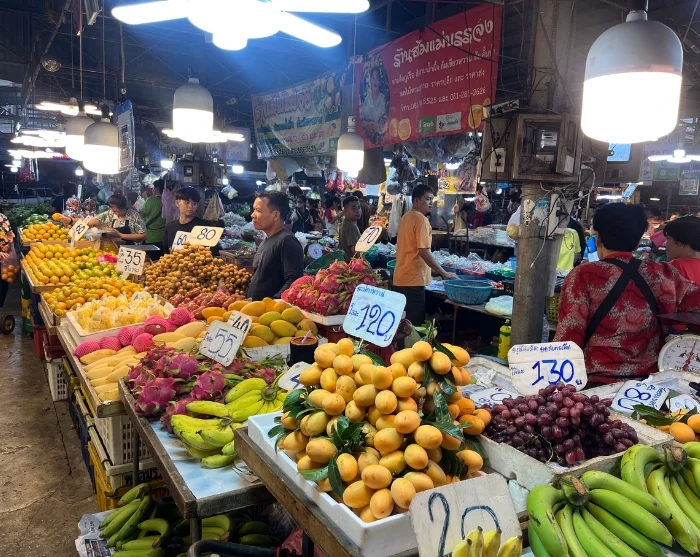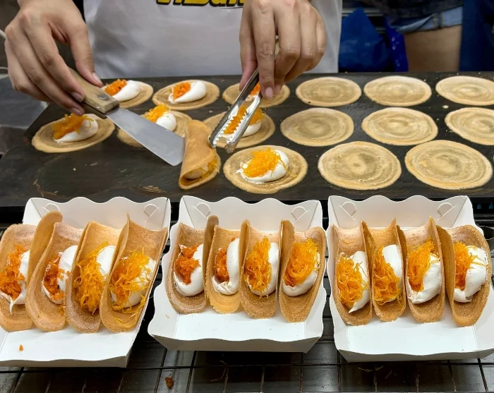 Der nächste Stopp ist ein lokaler Nachtmarkt, wo Sie Zeit haben, zwischen den zahlreichen Ständen zu schlendern. Sie erfahren mehr über lokale Delikatessen wie geschmortes Schweinebein (khao kha mu), Kokospudding und Klebreis mit Eiern (bua loi khai waan).