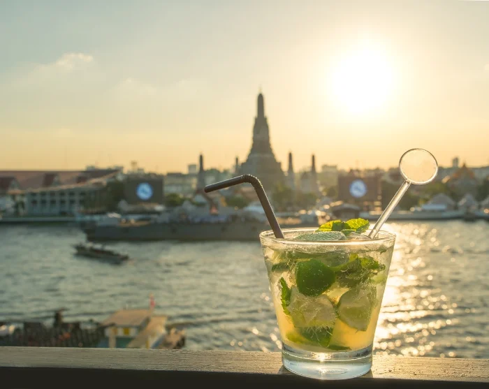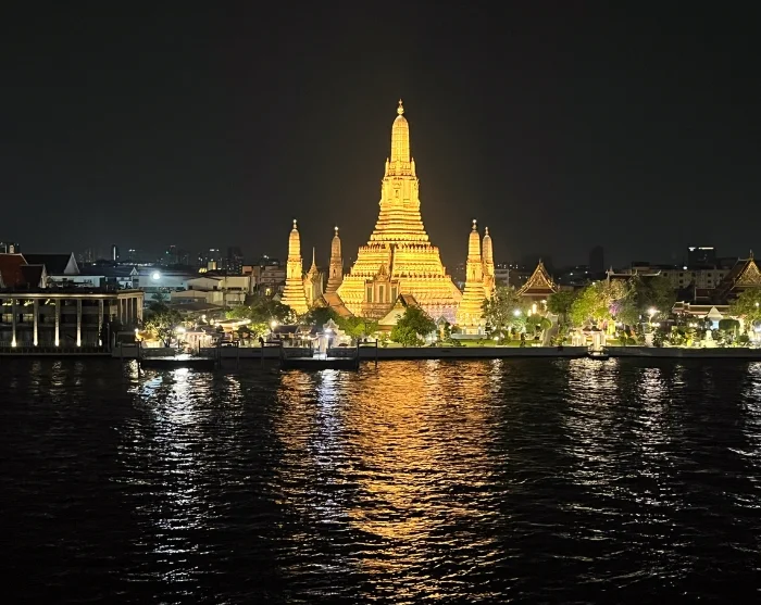 Der Abend endet in einer entspannten Rooftop-Bar mit Blick über den Chao Phraya River und auf den beleuchteten Wat Arun Tempel. Die Aussicht könnte nicht prachtvoller sein!