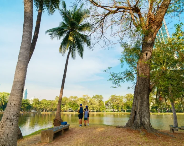 Nach einem Streifzug durch Bangkok in der tropischen Hitze und dem lärmenden Verkehr wird es sicherlich Momente geben, in denen Sie sich nach grüneren und ruhigeren Orten sehnen. Dies ist die perfekte Gelegenheit, um die Lumpini- oder Benjakiti-Parks zu besuchen. Alternativ können Sie die westliche Seite des Flusses erkunden, wo Sie eine völlig andere Welt erleben, ohne Wolkenkratzer und hupende Tuk-Tuks. Hier begegnen Sie dem traditionellen Bangkok mit seinem Labyrinth aus Kanälen, wo Häuser auf Stelzen errichtet sind und die Post per Boot zugestellt wird.