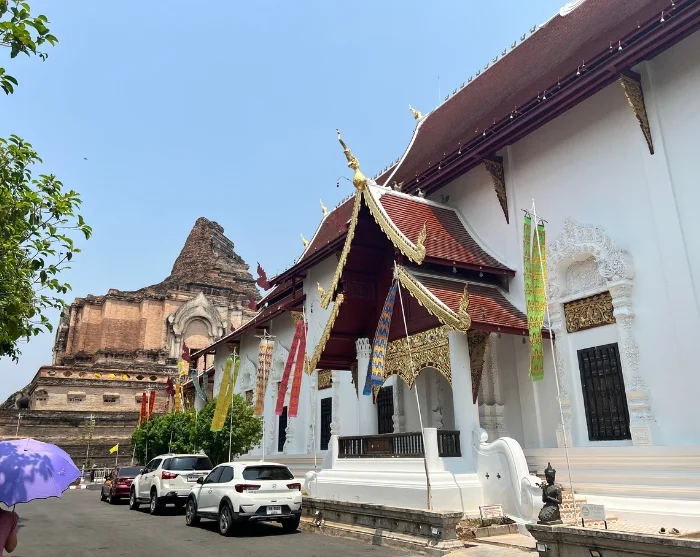 Sie werden zu unserem Partnerbüro gebracht, wo Sie ein Fahrrad und einen Helm erhalten. Nach einer kurzen Einweisung ist es Zeit, in die Pedale zu treten und den Charme der Stadt in sich aufzunehmen. Die Strecke ist einfach und flach, für die meisten Menschen geeignet. Sie radeln durch die kleinen und ruhigen Straßen Chiang Mais zum charmanten Wat Inthakhin Sadue Mueang, bekannt für seine 700 Jahre alte weiße Buddha-Statue. Die Fahrradtour führt weiter am Drei-Königs-Denkmal vorbei zum Stadttor, Tha Phae Gate, wo einst Händler Waren in die Stadt brachten. Hier wird der Guide Ihnen über die historische Rolle Chiang Mais als Handelszentrum erzählen. Anschließend geht es weiter zum nahegelegenen Somphet Markt, wo Sie Zeit haben, umherzuschlendern und die lokale Atmosphäre aufzusaugen. Sie haben zudem die Gelegenheit, die bunten Früchte und süßen Snacks zu probieren. Danach besuchen Sie Wat Chiang Man, den ältesten Tempel Chiang Mais. Er beherbergt den 1.800 Jahre alten Kristallbuddha und den 2.500 Jahre alten Marmor-Buddha. Schließlich besuchen Sie das größte und ikonischste Monument der Stadt, Wat Chedi Luang, das einst den Smaragd-Buddha beherbergte, der jetzt sicher im Wat Phra Kaew-Tempel in Bangkok verwahrt wird.