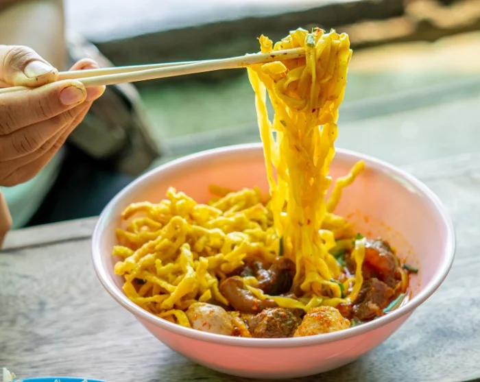 Nach 3–4 Stunden Radfahren kehren Sie zum Ausgangspunkt zurück, und ein wohlverdientes Mittagessen erwartet Sie. Das Mittagessen besteht aus ‘Khao Soi’, einer würzigen Nudelsuppe und einer Spezialität in Nordthailand. Es wird im Restaurant Naree De Klang Vieng serviert, das täglich von Insassinnen des Frauengefängnisses Klang Vieng betrieben wird. Dank des ausgezeichneten Rehabilitationsprojekts des Gefängnisses erhalten die Frauen, die typischerweise wegen drogenbezogener Vergehen verurteilt sind, die Möglichkeit, in verschiedenen Dienstleistungsberufen zu trainieren und auf ein neues Leben außerhalb der Gefängnismauern vorbereitet zu werden. Das Essen und der Service sind erstklassig!
