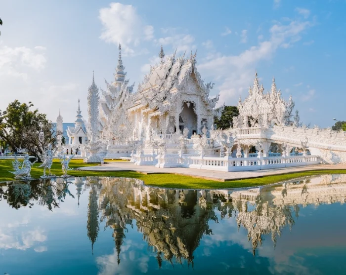 Auf dem Weg nach Chiang Rai besuchen Sie den beeindruckenden Rong Khun Tempel, besser bekannt als der Weiße Tempel. Dieses moderne Meisterwerk aus dem Jahr 1997 wurde von dem lokalen Künstler Chalermchai Kositpipat geschaffen und hebt sich bemerkenswert von den traditionellen Tempeln Thailands ab. Die einzigartige weiße und silberne Fassade symbolisiert Reinheit und Erleuchtung, während die vielen Details sowohl religiöse als auch überraschend moderne Anspielungen bieten.
