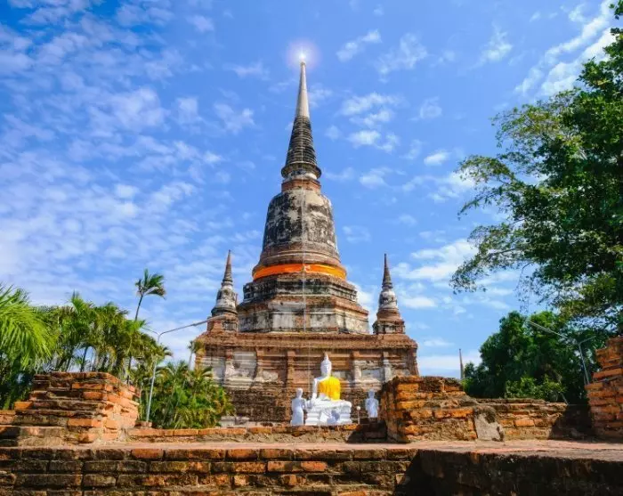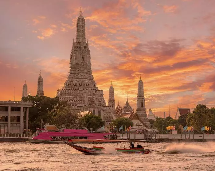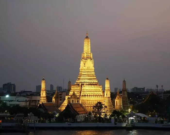 Unterwegs erhaschen Sie Blicke auf mehrere beliebte Sehenswürdigkeiten Bangkoks, die abends wunderschön beleuchtet sind. Darunter befindet sich das Demokratiedenkmal, das den Übergang Thailands von der absoluten zur konstitutionellen Monarchie gedenkt. Das Denkmal steht an der belebten Ratchadamnoen Avenue, nicht weit entfernt vom Großen Palast.