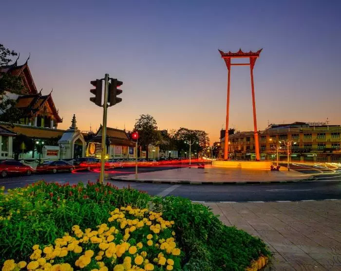 Zurück im Tuk-Tuk fahren Sie am 27 Meter hohen Giant Swing vorbei, einem historischen und kulturellen Wahrzeichen am Wat Suthat Thepwararam Tempel.