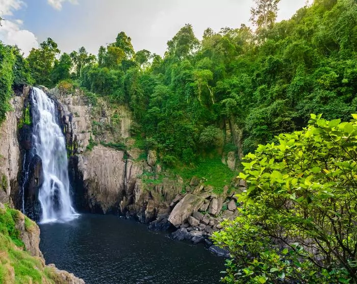 Sie wandern zurück zum Ausgangspunkt und werden zum Haew-Narok-Wasserfall gefahren, der zu den schönsten Wasserfällen des Nationalparks gehört. Er besteht aus drei Stufen und hat eine Gesamthöhe von etwa 150 Metern, was ihn zum höchsten Wasserfall von Khao Yai macht. Vom Parkplatz bis zum Wasserfall ist es ein Fußmarsch von etwa 1 km über einen Naturpfad und Stufen durch den üppigen Wald. Bitte beachten Sie, dass es in der Regenzeit sehr rutschig sein kann und der Weg nicht für Gehbehinderte geeignet ist.