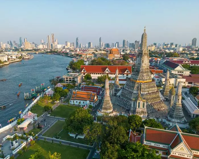 Bangkok wird durch den 372 km langen Fluss Chao Phraya in Ost und West geteilt. Der östliche Teil der Stadt gilt als das Zentrum Bangkoks mit beliebten Vierteln wie Sukhumvit, Silom und China Town, in denen es eine hohe Konzentration von Einkaufszentren, guten Restaurants und lokalen Märkten gibt. Auf der Ostseite befindet sich der historische Teil Bangkoks mit dem berühmten Königspalast Grand Palace und dem Tempel des Smaragdbuddhas, Wat Phra Kaew.