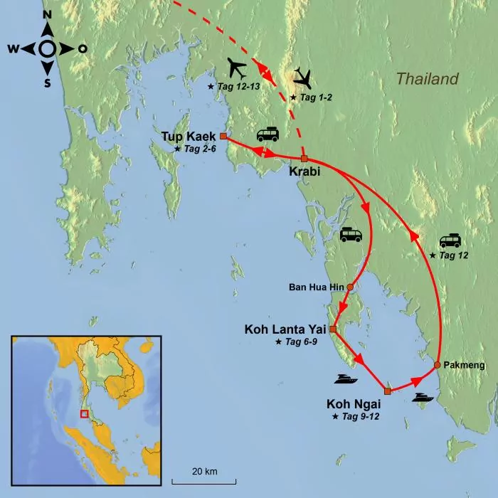 Ihre Reise beginnt in Krabi. Übernachten können Sie in der Nähe von Tup Kaek oder in Ao Nang. Hier warten Entspannung und ein ereignisreiches Inselhopping zu den schönsten, absolut einzigartigen Inseln und Stränden der Andamanensee auf Sie, beispielsweise Phra Nang Beach – einer der schönsten Strände Thailands.