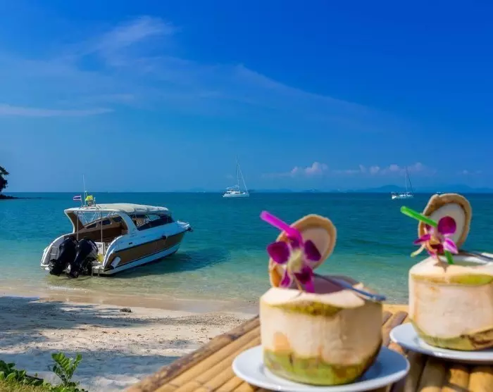 Sie werden von Ihrem Hotel abgeholt und zum Pier gefahren, wo ein traditionelles Longtail-Boot auf Sie wartet, um Sie auf das türkisblaue Meer hinauszufahren.