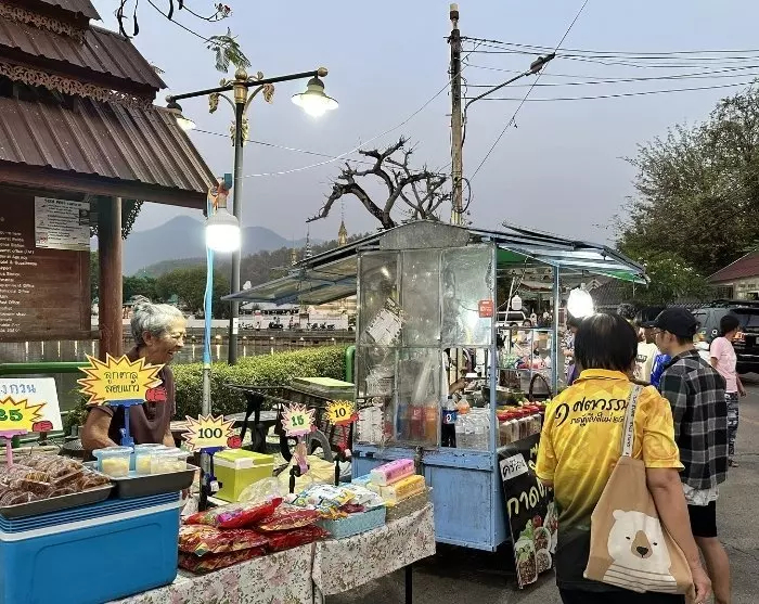 Jeden Abend verwandelt sich die Walking Street in einen lebhaften Nachtmarkt, wo Sie alle Essbuden erkunden und sich von der lokalen Küche verführen lassen können. Das Abendessen wird wie bei den Einheimischen auf einer Decke an einem niedrigen Tisch gegessen. Hier können Sie auch den Wat Chong Kham Tempel bewundern, der sich im gleichnamigen See dahinter spiegelt.