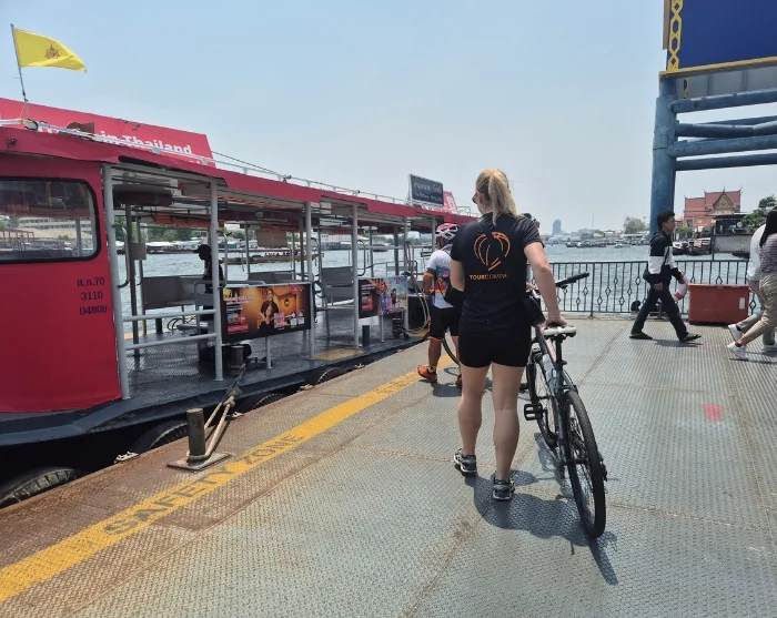 Nach einer kurzen Einweisung und dem Anpassen des Fahrrads fahren Sie mit einem fachkundigen und erfahrenen Radguide los. Der Weg ist einfach und flach, sodass fast alle daran teilnehmen können. Sie fahren durch das beliebte Backpacker-Viertel Khaosan Road, durch kleine Gassen, vorbei an winzigen Kanälen. Dann geht es für Sie weiter am Ufer des Flusses Chao Phraya, zur Rama-VIII.-Brücke. Dort überqueren Sie den Fluss und fahren in den Westen Bangkoks, das authentische Gebiet der Stadt. Dort besuchen Sie alte Tempel und erleben die Einheimischen hautnah. Anschließend fahren Sie am großen Kanal Bangkok Noi entlang, durch kleine verschlafene Gassen, vorbei an einem kleinen Dorf. Die Einheimischen freuen sich immer, lächeln und winken Ihnen zu. Sie überqueren eine kleine Brücke und fahren nun auf der anderen Seite des Kanals weiter. Sie kommen an buddhistischen Tempeln und am Abstellgelände für Züge in Thonburi vorbei. Danach fahren Sie mit der Fähre zurück in den Osten Bangkoks, in den belebten Teil. Sie fahren am Königspalast Grand Palace vorbei. Sie stellen das Fahrrad ab und spazieren zum wunderschönen, nahe gelegenen Park Saranrom, der einst von der Königsfamilie genutzt wurde. Dann schwingen Sie sich wieder auf das Fahrrad und fahren zu einem herrlich duftenden Essensmarkt. Sie halten bei Giant Swing und legen an diesem beliebten Wahrzeichen Bangkoks einen letzten Stopp ein.