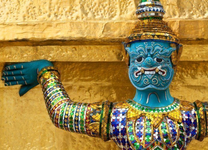 Bangkok kann man beinahe nicht verlassen, ohne den Königspalast Grand Palace gesehen zu haben, den auch wir nun besuchen. Dieser prunkvolle Palast wurde 1782 erbaut und strahlt eine Schönheit aus, die man schwer beschreiben kann. Man muss sie einfach erleben. Der Palast besteht nicht aus einem Gebäude, sondern aus mehreren Gebäuden, Hallen, Pavillons und Tempeln. Aus ganz Thailand pilgern Buddhistinnen und Buddhisten hierher, um der heiligsten Buddha-Statue von Thailand, dem Smaragd-Buddha, ihren Respekt zu zollen. Er wurde aus einen riesigen Stück Jade gehauen und ragt hoch auf einem Altar im berühmten Heiligtum Wat Phra Kaeo auf. Bis 1925 war der Grand Palace außerdem das Zuhause der thailändischen Königsfamilie. Auch heute noch wird er für königliche Zeremonien und Staatsbesuche genutzt.