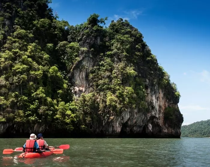 Weiter geht es mit dem Langboot. Sie besuchen die Inseln Koh Aung und Koh Talabeng mit ihren typischen Kalksteinfelsen und wunderschönen Buchten. Vor Koh Talabeng wartet eine unvergessliche Fahrt mit dem Kajak rund um die Insel auf Sie. Sie erleben die unberührte Natur, die beeindruckenden Kalksteinfelsen und die faszinierenden Höhlen.