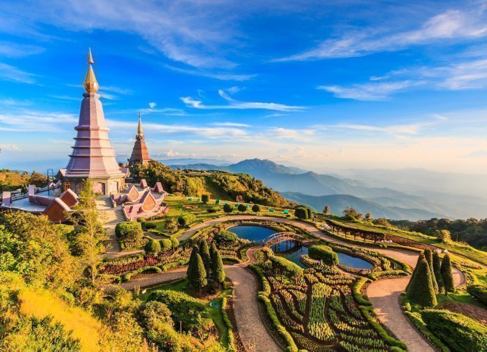 Dann besuchen Sie den gut gepflegten wunderschönen Garten des Berges, in dem sich zwei große Pagoden mit goldenen Türmen gen Himmel recken. Diese wurden in Gedenken an König Bhumibol Adulyadej (Rama IX) und seine Frau errichtet. Die Aussicht von hier oben ist bei Fernsicht einfach fantastisch. Tiefgrüne Wälder legen sich wie Teppiche über die hügelige Landschaft.