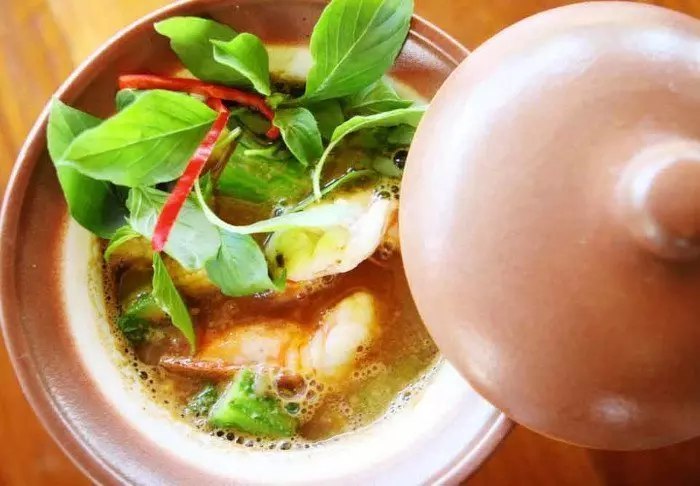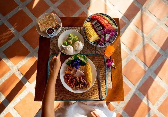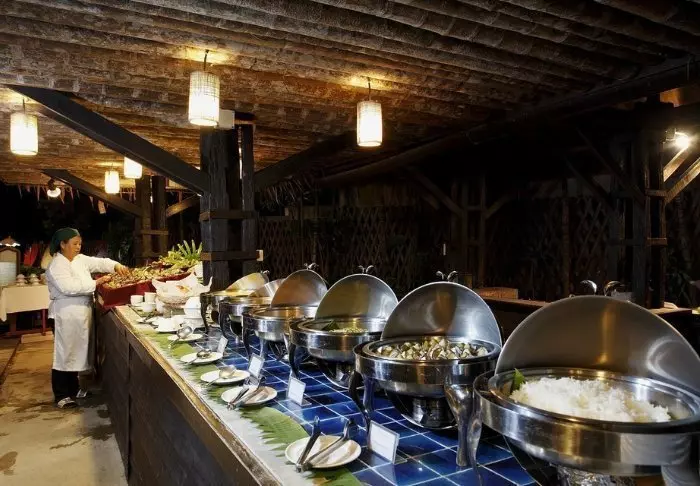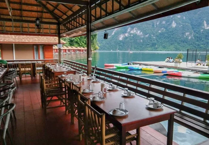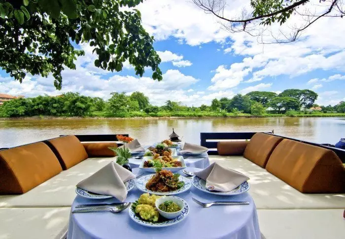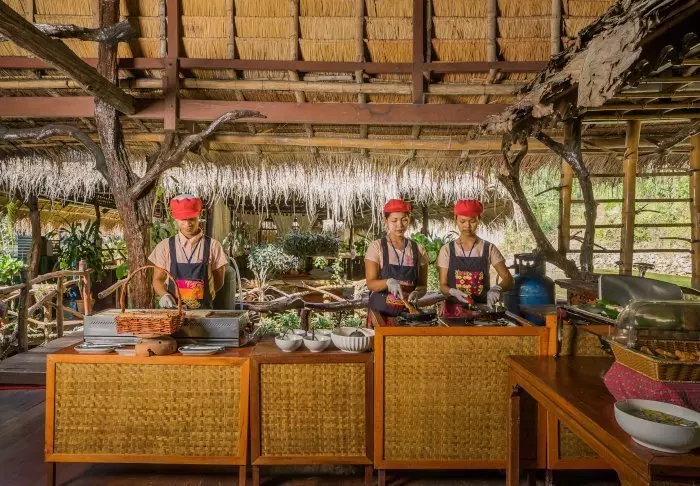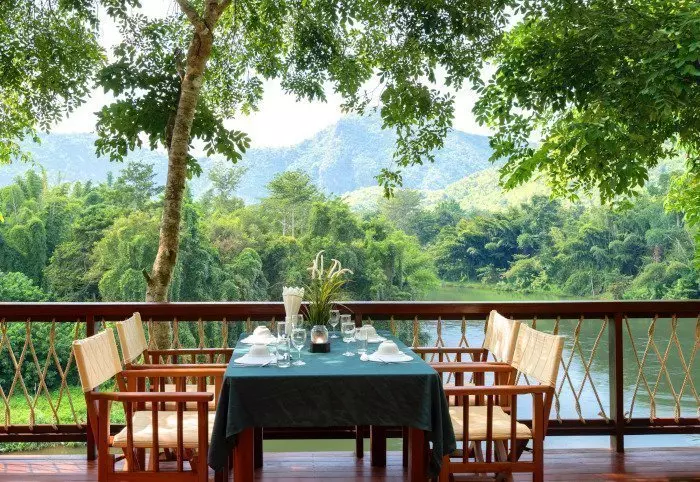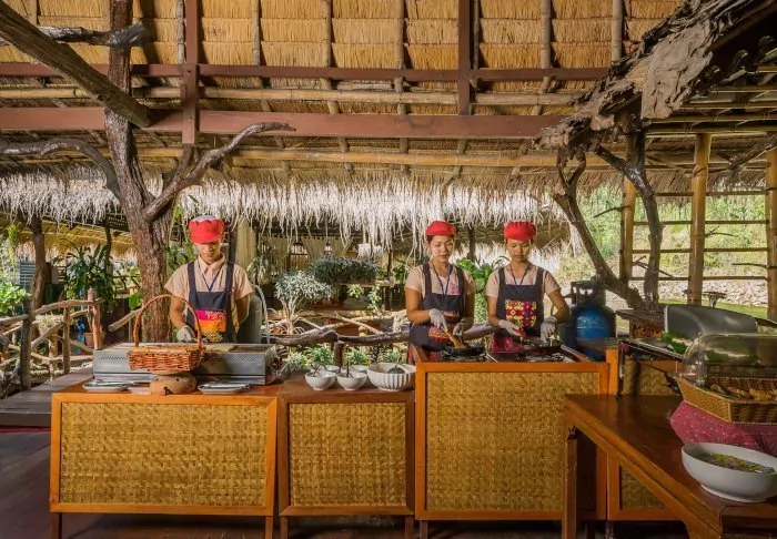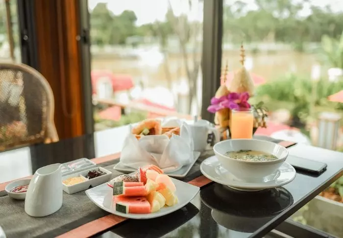 Die Mahlzeiten werden als köstliche thailändische Gerichte in einem gemütlichen, offenen Restaurant mit Blick auf den Fluss serviert. Wenn die Nacht hereinbricht, wird der Ort von Laternen erleuchtet, die eine magische Atmosphäre schaffen.