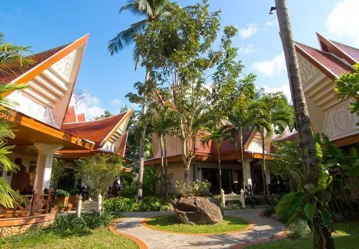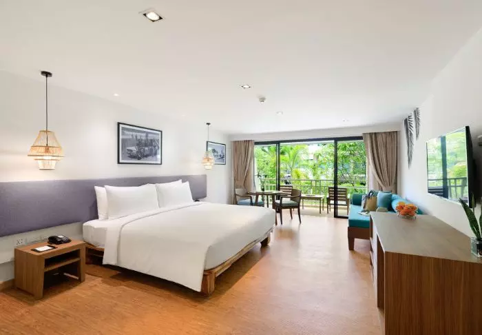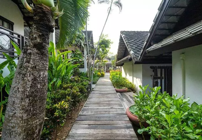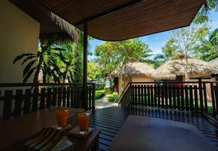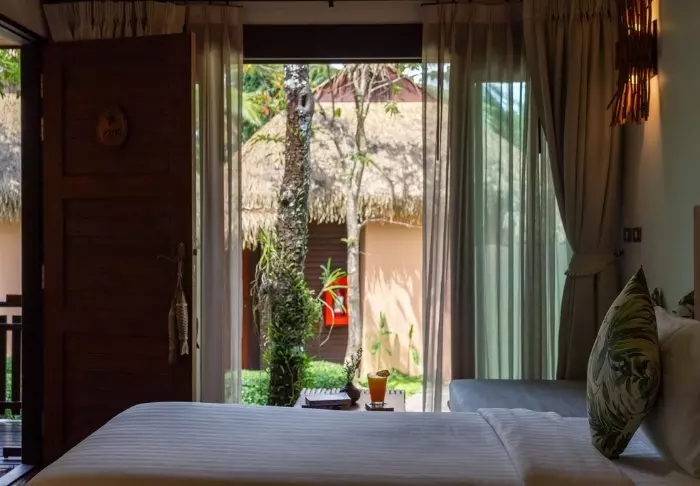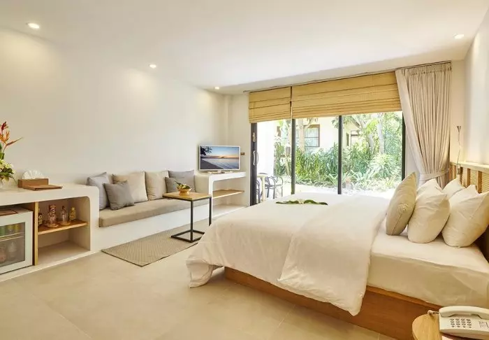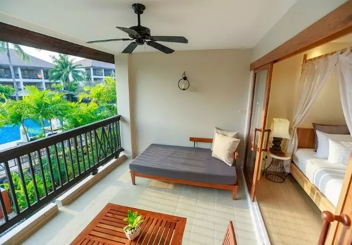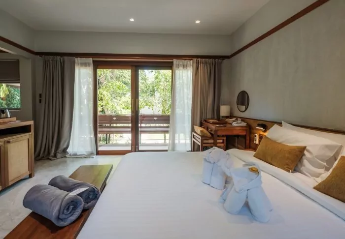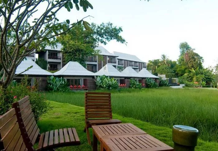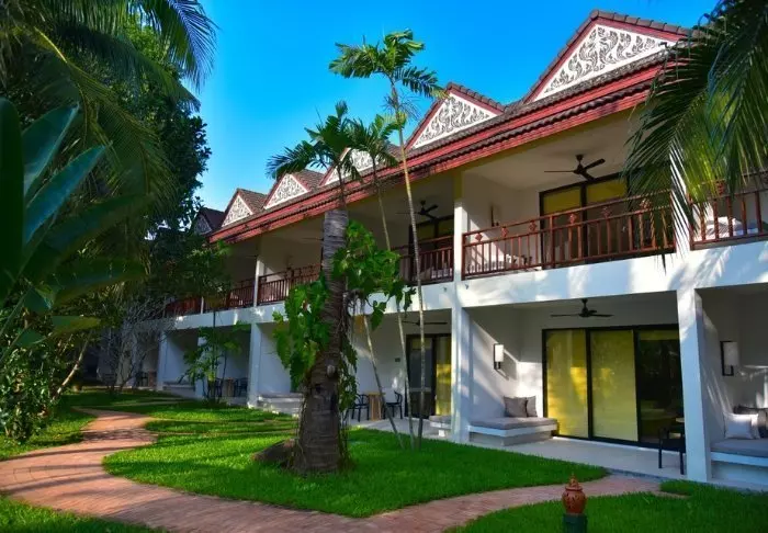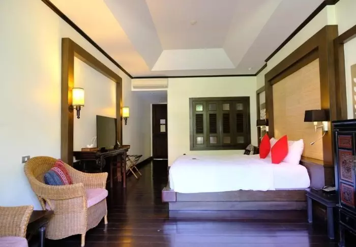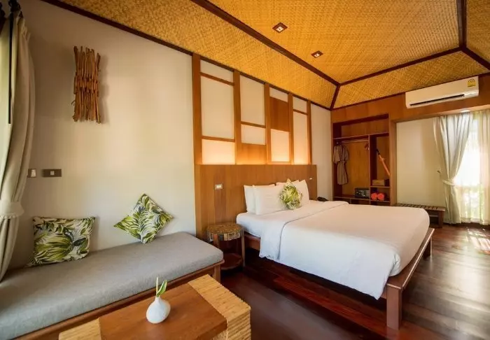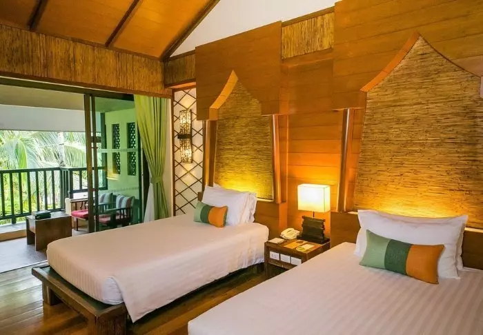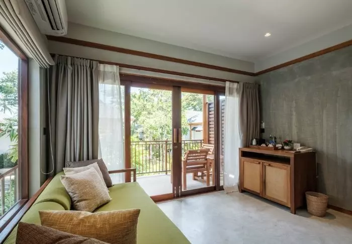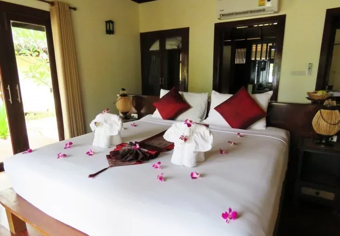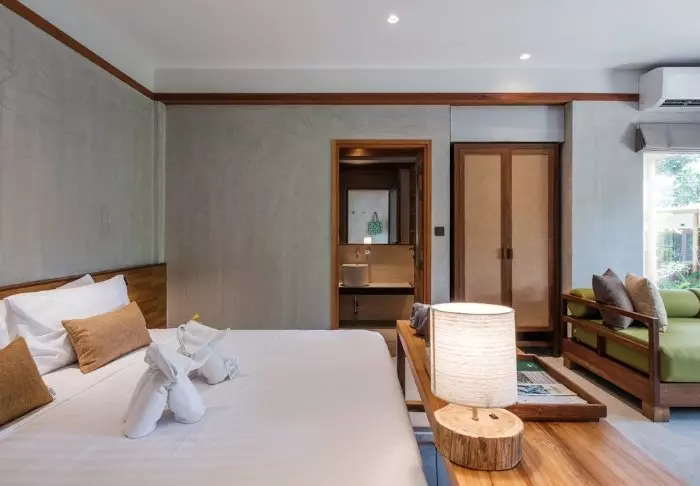 Das Resort liegt inmitten von Palmen und tropischen Bäumen. Direkt im blühenden Garten stehen die Bungalows sowie ein eigenes Hotelgebäude mit Aussicht auf und Zugang zum Pool. Das Resort bietet insgesamt 80 hervorragend eingerichtete und mind. 35 m² große Zimmer, die Eleganz mit thailändischem Charme und Naturmaterialien kombinieren. Jedes Zimmer wurde mit Liebe zum Detail ganz auf Komfort und Ruhe ausgelegt. Alle Zimmer sind mit WLAN, Klimaanlage, Minibar, Safe, TV-Gerät sowie einer Tee- und Kaffee-Ecke ausgestattet. Vom kleinen Schlafsofa aus können Sie den Blick auf die grünen Gärten schweifen lassen. Jedes Zimmer verfügt sogar über eine möblierte Terrasse oder einen möblierten Balkon, von wo aus Sie die Umgebung und die wohlverdiente Ruhe genießen können. Das Badezimmer bietet sowohl eine Regendusche als auch eine Badewanne, einen Föhn und kostenlose Toilettenartikel.