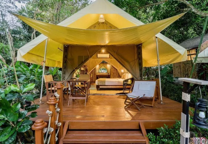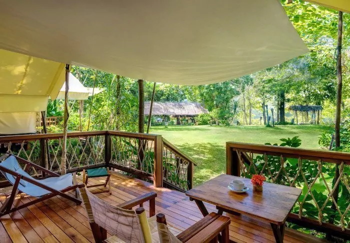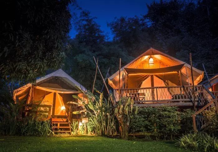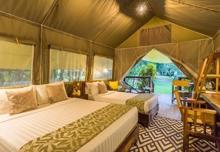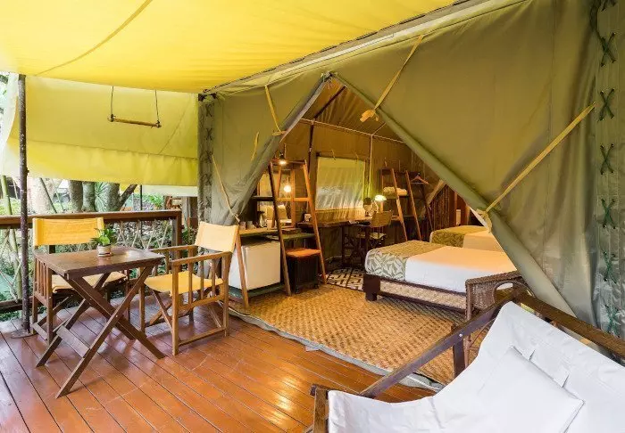 Das Camp besteht aus 38 luxuriösen Leinenzelten, die zwischen 26 und 32 m² groß und einen halben Meter über dem Boden aufgebaut sind. Alle sind mit richtigen Betten, einem eigenen Badezimmer mit Warmwasser, Föhn und Toilettenartikeln sowie mit einer eigenen Veranda ausgestattet, von der aus Sie die Stille und die grüne Umgebung genießen können. Sämtliche Zelte verfügen außerdem über WLAN, Klimaanlage, Schminktisch/Schreibtisch, gratis Mineralwasserflaschen, einen Kühlschrank und einen Wasserkocher für Tee und Kaffee. Nach 22 Uhr muss es leise sein im Camp. Keine laute Musik, nur die Geräusche des Dschungels.