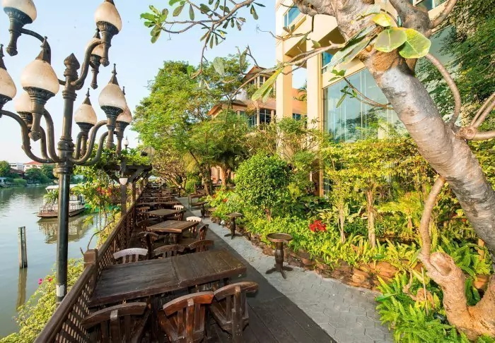 Das Restaurant des Resorts, das Nam Khang Restaurant, bietet eine wunderschöne Aussicht auf den Kanal und hat morgens, mittags und abends geöffnet.
