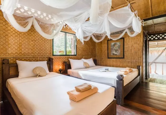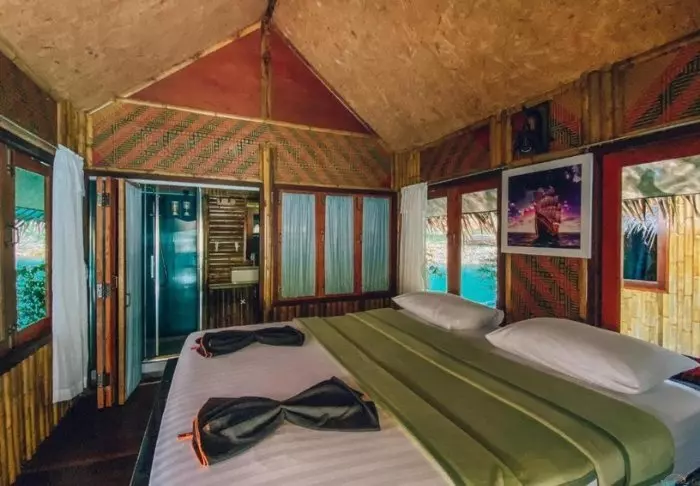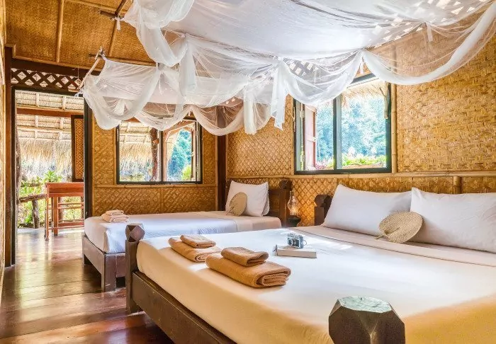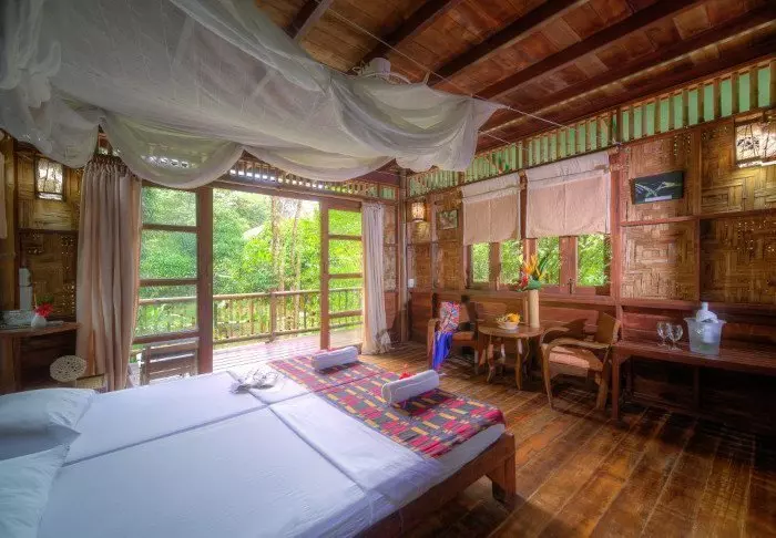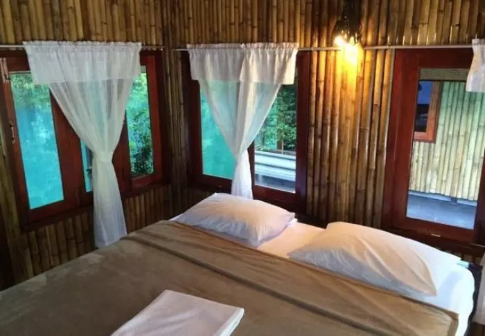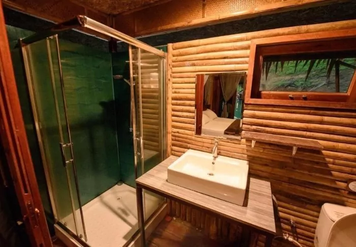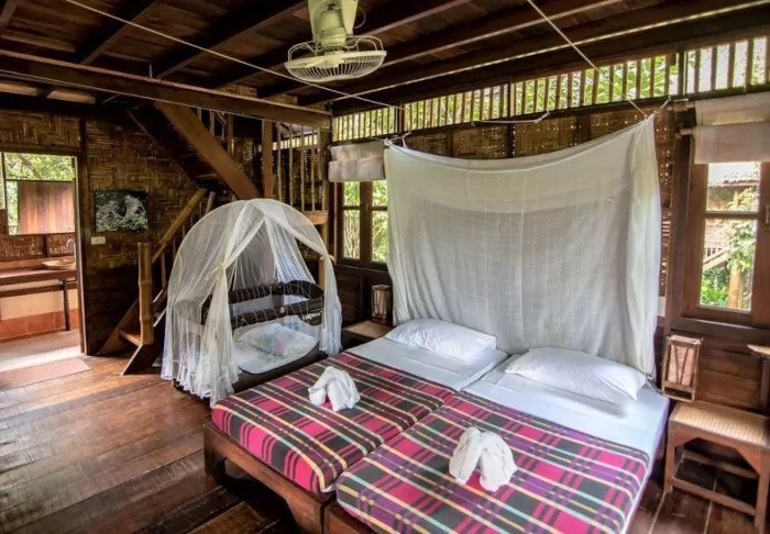 Das Flotel besteht aus zwei Abschnitten mit insgesamt 100 Bambushütten. Die Zimmer sind einfach eingerichtet mit bequemen Betten und Moskitonetzen, einem Handventilator, Taschenlampe, Schminktisch, abgefülltem Mineralwasser und Schwimmweste. Die Zimmer haben keinen Strom, daher gibt es keine Minibar oder WLAN. Auf Ihrer privaten Veranda können Sie in einer Hängematte entspannen und den Blick auf den ruhigen Fluss mit hoch aufragendem Bambus am Ufer und wilden Orchideen in den Bäumen genießen. Sie können zudem von der Veranda aus direkt ins erfrischende Wasser springen oder Kanu fahren. Jedes Zimmer verfügt über ein eigenes Bad mit Toilette, Hygieneartikeln und einer Kaltwasserdusche.