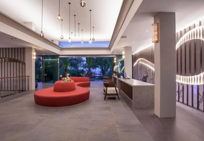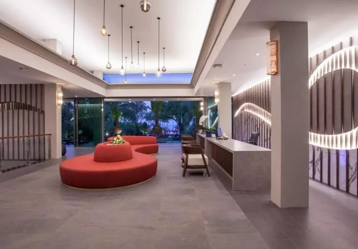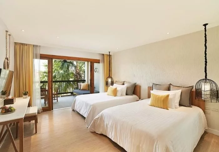 Das Hotel besteht aus mehreren Gebäuden inmitten grüner Umgebung, mit gepflegten Gärten und hohen Palmen, die sanft im Wind wiegen. Die 116 Zimmer des Resorts sind so gestaltet, dass sie Ihnen eine private und friedliche Oase bieten. Jedes Zimmer ist hell und modern eingerichtet und fügt sich nahtlos in die natürliche Umgebung ein. Von der möblierten Terrasse aus können Sie den grünen Garten, der das Resort umgibt, bewundern, während Sie einen entspannten Morgenkaffee oder eine ruhige Pause genießen. Jedes Zimmer ist mit modernen Annehmlichkeiten ausgestattet, darunter WLAN, eine Klimaanlage, ein Safe, eine Minibar, eine Kaffeemaschine und Mineralwasser ist zudem in Flaschen bereitgestellt. Das Badezimmer ist ein Erlebnis für sich, mit sowohl einer Badewanne als auch einer Regendusche, sowie Pflegeprodukten, einem Haartrockner und einem Bademantel.