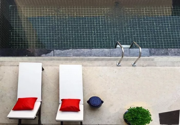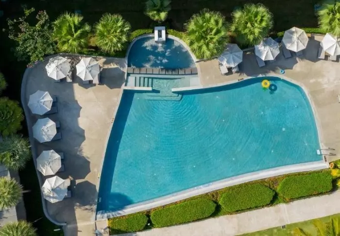 Wenn Sie nicht gerade Sehenswürdigkeiten besuchen, können Sie sich mit einem Bad im Swimmingpool für Alt und Jung abkühlen. Die zugehörigen Liegestühle und hohen grünen Palmen sorgen für echte Tropenstimmung.