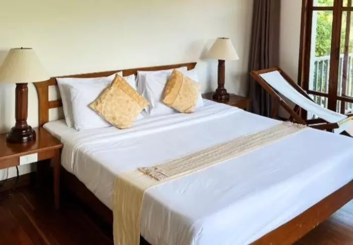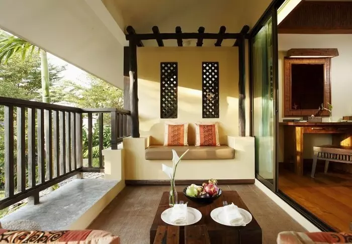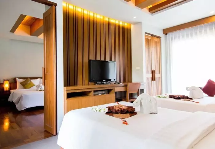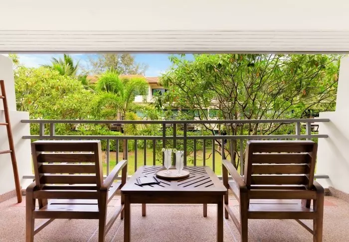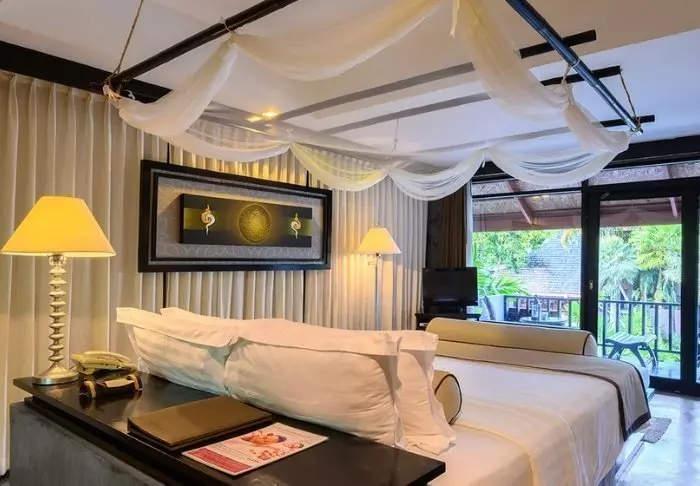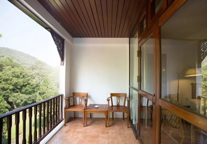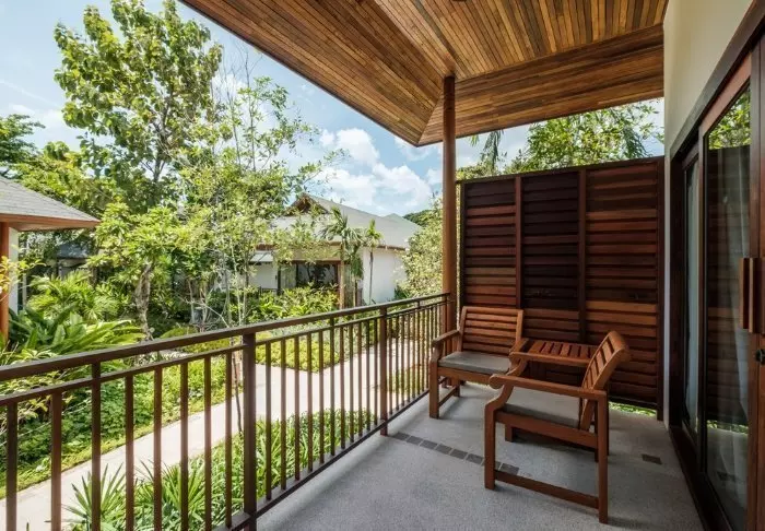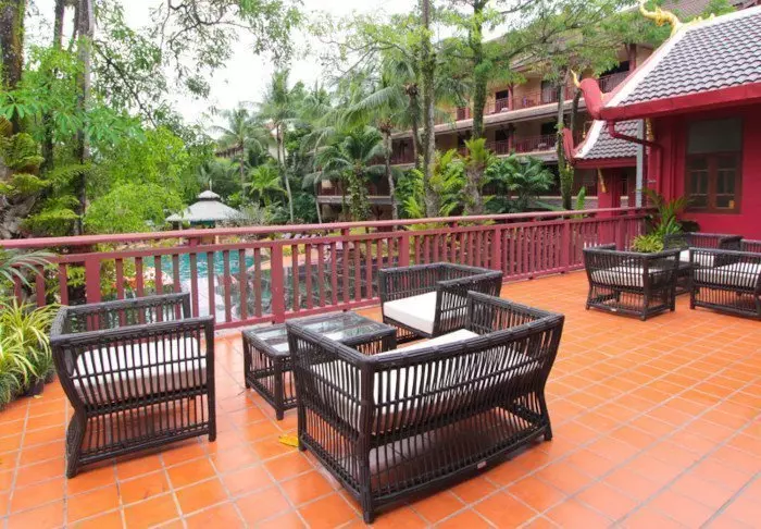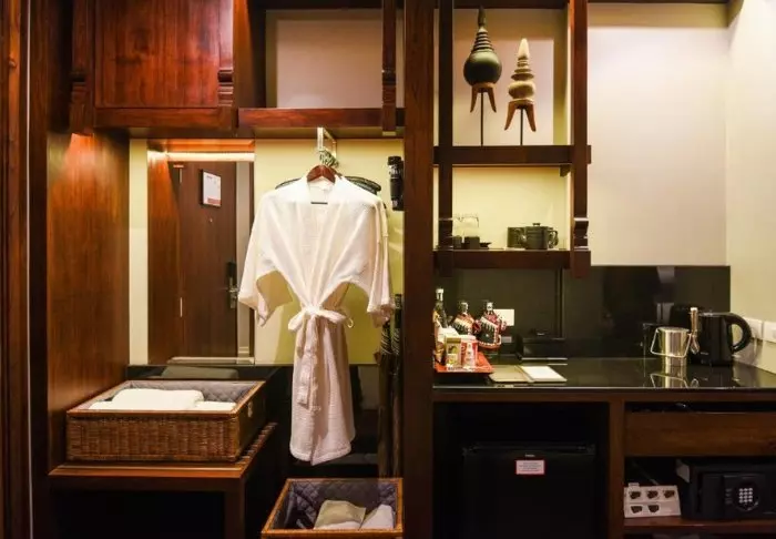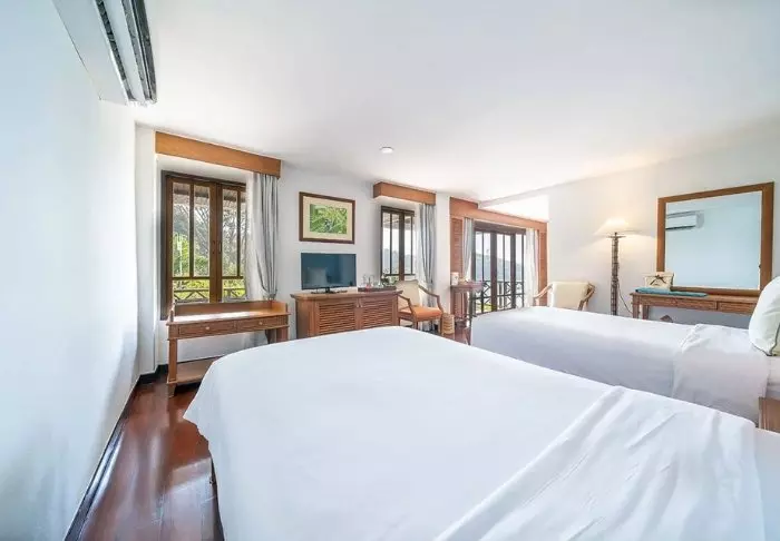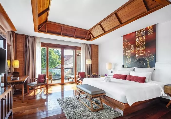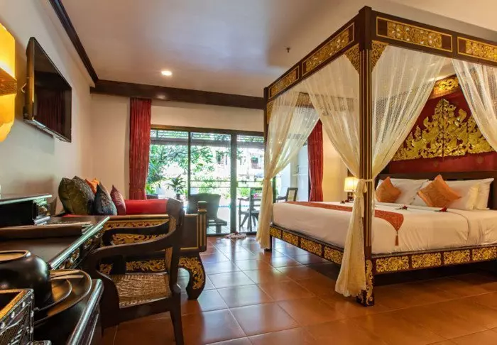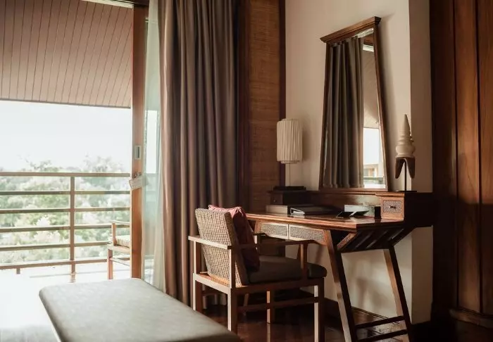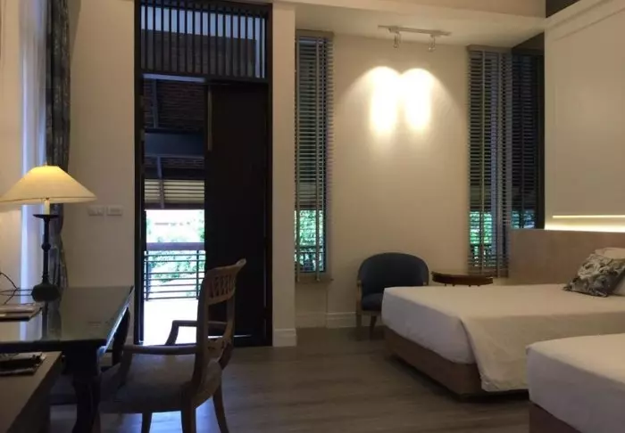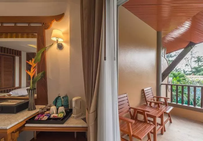Die Zimmer sind auch im thailändischen Stil, mit wunderschönen Holzschnitzereien und Mustern auf Kissen und Teppichen eingerichtet. Es gibt ein TV-Gerät, eine Kaffee- und Tee-Ecke, eine Klimaanlage, einen Safe, eine Minibar, einen Föhn – und einen Regenschirm, falls einmal ein tropischer Regenschauer kommt. Alle Zimmer haben darüber hinaus einen eigenen Balkon.