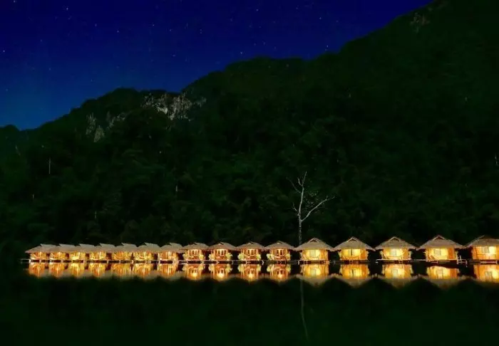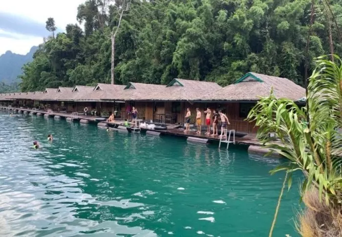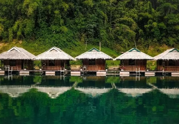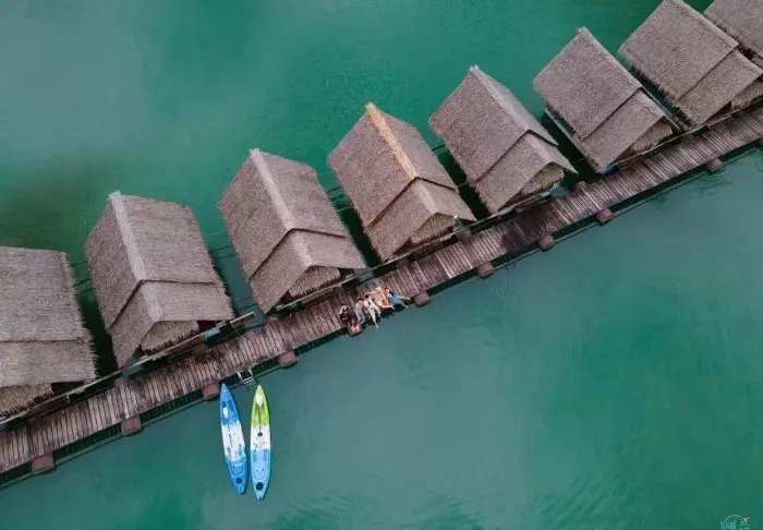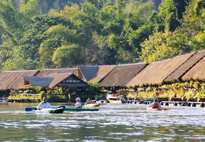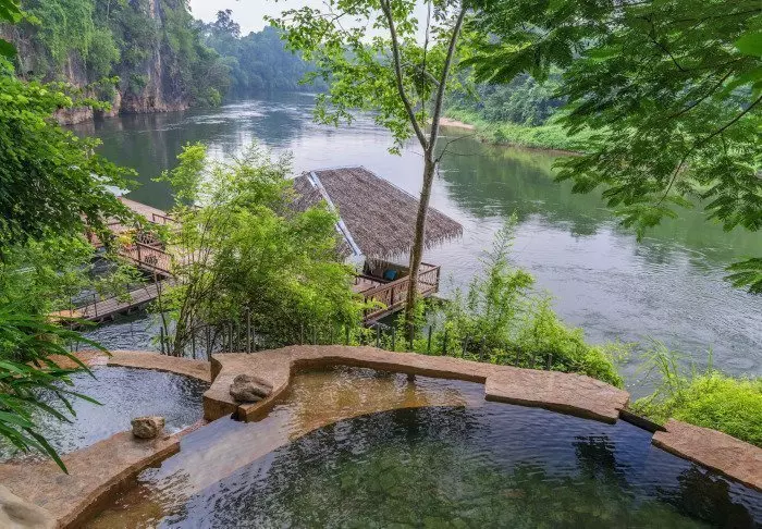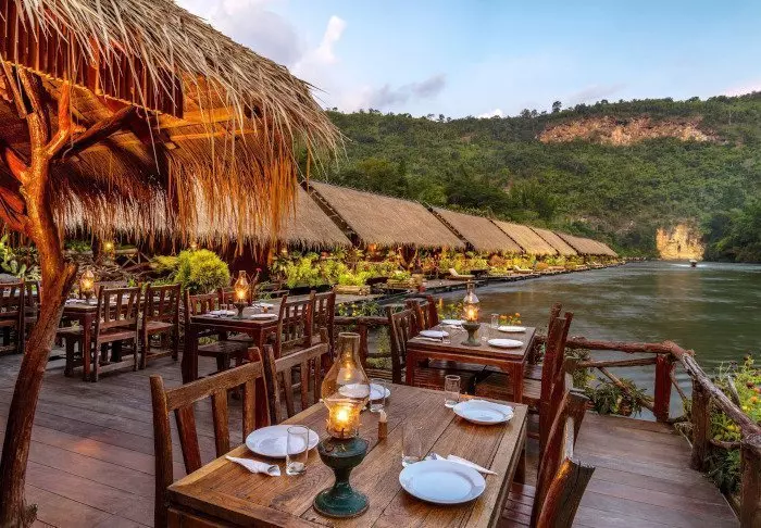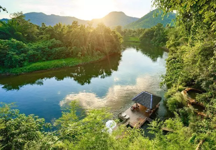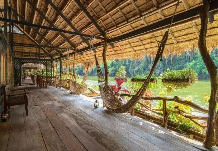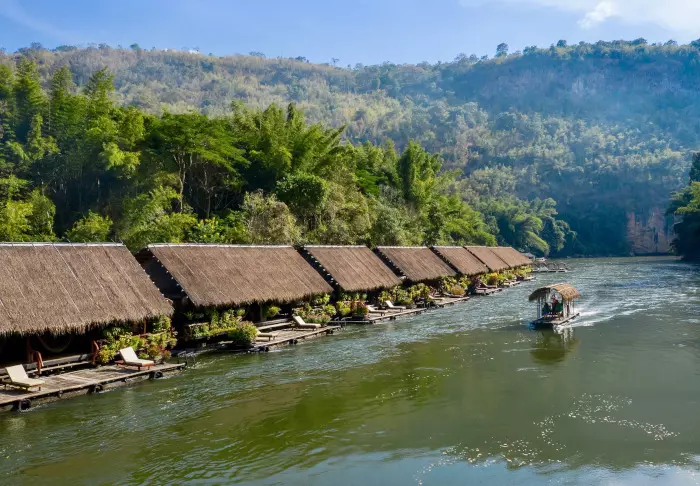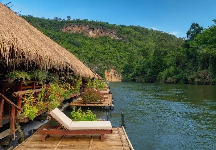 Das einzigartige River Kwai Jungle Rafts ist ein schwimmendes Hotel – ein Hotel auf einem Floß gebaut –, das Ihre Vorstellung von Luxus verändern wird. Das sogenannte Flotel ist sicher im Kwai-Fluss verankert und durch einen Steg mit dem Ufer verbunden.