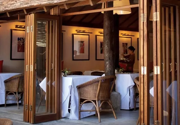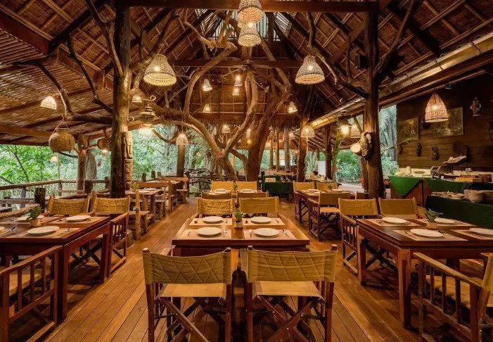 Das Restaurant des Camps ist ebenfalls vom Boden abgehoben und bietet eine wunderschöne Aussicht auf die Landschaft. Es hat morgens, mittags und abends geöffnet. Serviert wird ein leckeres abwechslungsreiches Menü, jeden Abend wird im Garten gegrillt. An der Bar erhält man eine große Auswahl an Getränken, Wein, Bier und Softdrinks.
