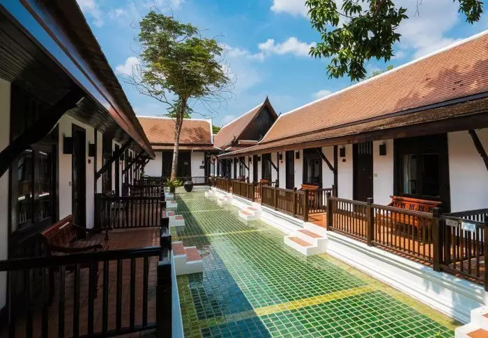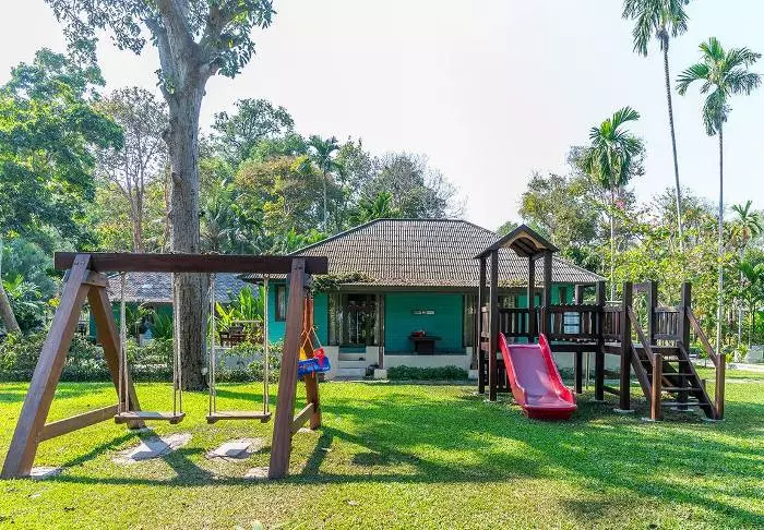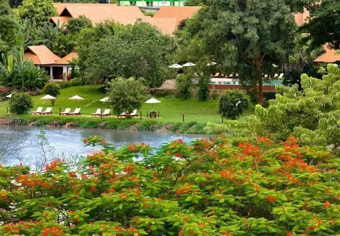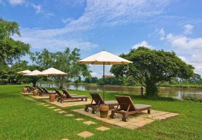 Das Resort wurde im traditionellen Lanna-Stil errichtet und harmoniert perfekt mit der Umgebung. Die Gebäude sind über das große Grundstück verteilt, das mit schattigen Wegen, Lotus-Teichen, Blumengärten und einem großen Rasen mit Liegestühlen aufwarten kann, in denen Sie sich entspannen und die Aussicht auf den Fluss genießen können.