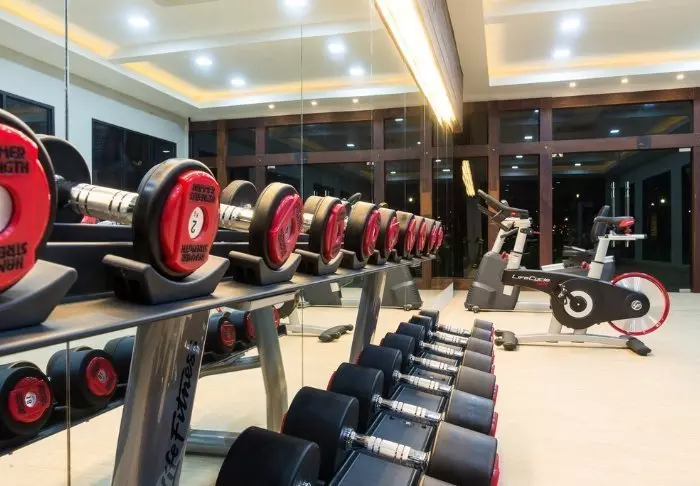 Zur weiteren Ausstattung zählt auch ein Fitnessraum mit Hanteln und verschiedenen Geräten.